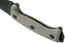 El Junglas de ESEE Knives es el cuchillo definitivo para los que quieran abrirse camino con un machete. Cuando quieres un cuchillo grande para cortar, pero no un machete. Una ventaja añadida en comparación con los machetes, es que este cuchillo está súper afilado al sacarlo de la caja, mientras que la mayoría de los machetes apenas tienen un buen filo para cortar. Además, es bonito y fuerte, lo que hace que el corte y el picado sean más fáciles. El mango de micarta es grande y tiene una excelente forma ergonómica. Tiene un tacto ligeramente rugoso, lo que es bueno para el agarre y la comodidad. Si es necesario, las piezas de la empuñadura se pueden quitar fácilmente.