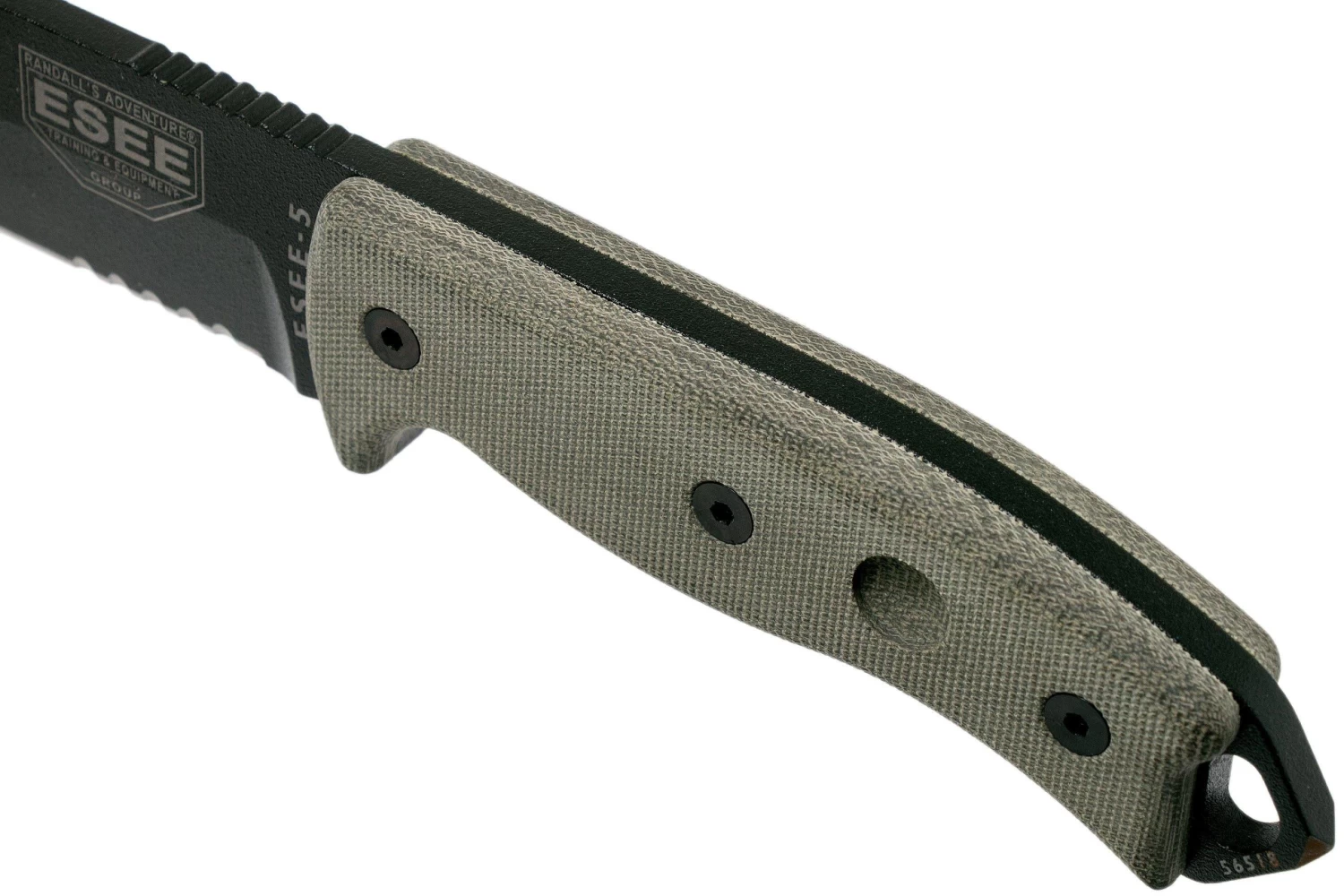 El ESEE Model 5 es un s贸lido cuchillo de supervivencia con una hoja hecha de acero al carbono 1095. El revestimiento en polvo extremadamente sostenible de la hoja la protege de la sensibilidad a la corrosi贸n del acero carbono. Las maravillosas cualidades de uso del acero garantizan una vida de satisfacci贸n. La hoja full-tang se ha mejorado con un mango de micarta. Este mango se siente un poco rugoso, lo que es estupendo para el agarre y la comodidad. El ESEE Model 5 es un cuchillo grande y s贸lido que puede aguantar un uso extremadamente intenso. Si su tama帽o y peso te parecen demasiado, el Model 4 o el Model 3 son excelentes alternativas m谩s peque帽as.