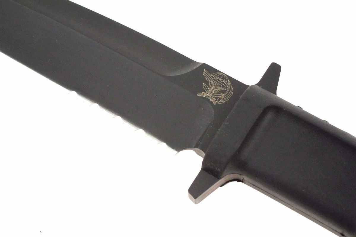 Encargado y adoptado oficialmente en 2002 por el Noveno Rgto. Incursori «Col. Moschin», este modelo es la quintaesencia de un cuchillo de combate puro con una hoja asimétrica. Utilizado por los Arditi, en cuyos pasos sigue el Regimiento Col Moschin, ha sido reelaborado en una forma moderna, dotado de una hoja parcialmente lisa y dentada, guardas integrales y un E.R.M.H. desmontable. Mango en Forprene. La molienda es hueca y afilada. El centro de gravedad está hacia el final del mango, la punta especialmente afilada, es ligera, manejable e intuitiva.