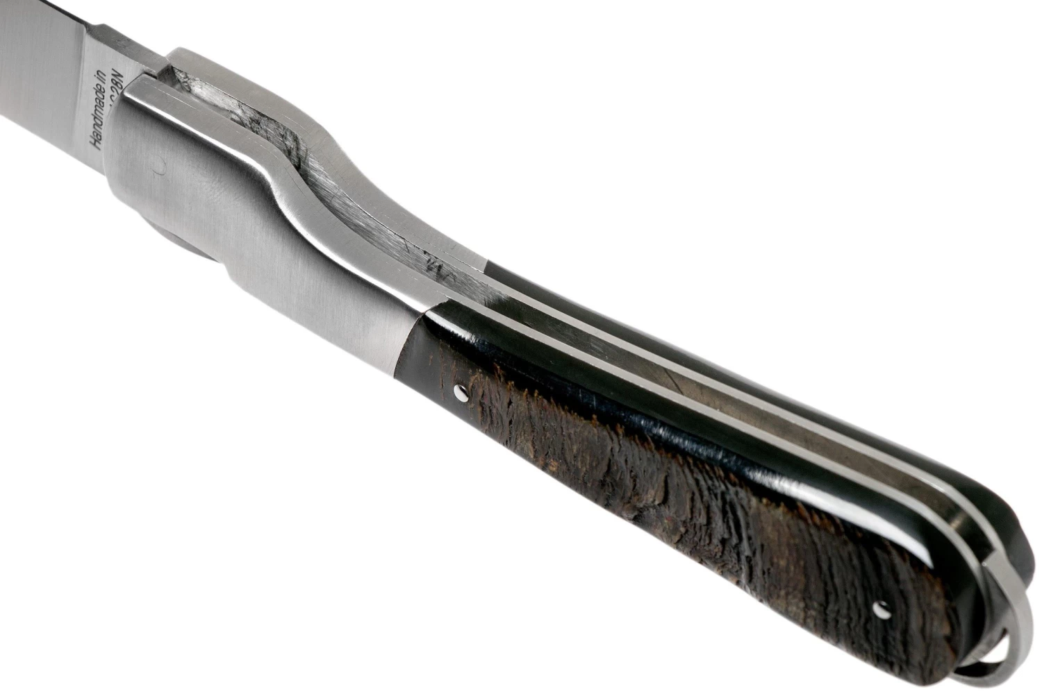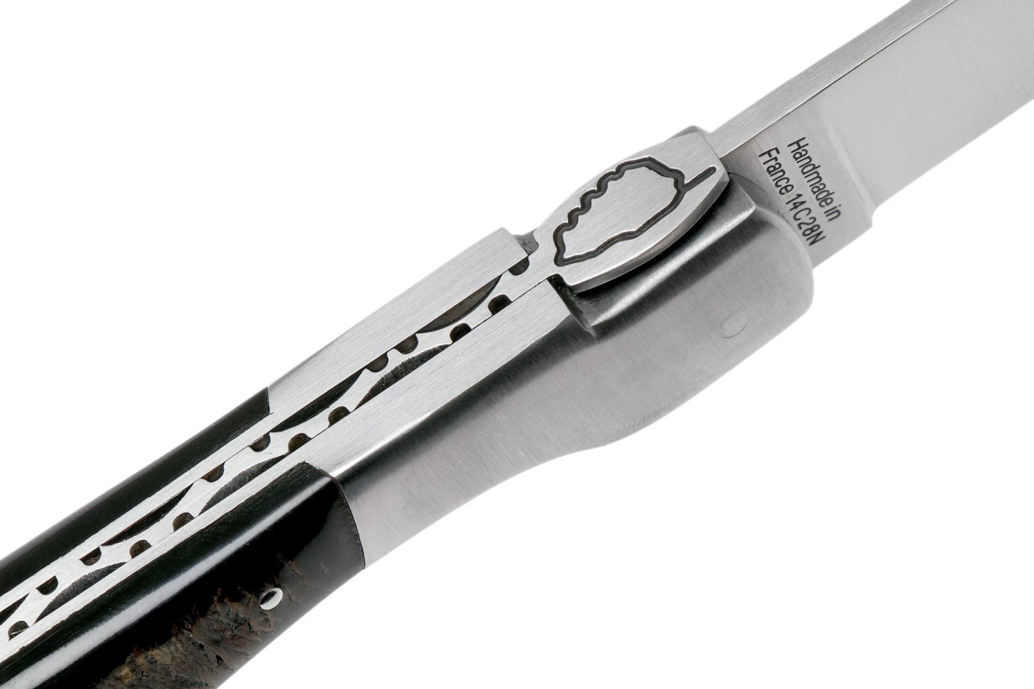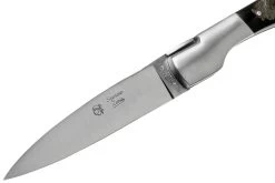 Clásica navaja francesa hecha a mano de Laguiole. Longitud cerrada: 12,3 cm. Cuenta con una hoja de acero 12c27 y un sistema de bloqueo backlock. El mango está hecho de corteza de cuerno de búfalo.