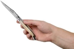 Este cuchillo Laguiole en Aubrac de 12 cm es un verdadero clásico. La parte posterior del mango está ricamente decorada con un delicado trabajo de limado. La hoja está hecha de acero inoxidable Sandvik 12c27. Tanto los cabezales como la hoja están abrillantadas. Esto le da al cuchillo un aspecto muy elegante. Los lados de los mangos tienen la tÃpica cruz de pastor de Laguiole.