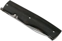 La Maserin Stralight 392/KT es una navaja ligera con un diseño excéntrico. La forma del mango parece poco ortodoxa. ¿Se siente bien en la mano? ¡Sí! Los dedos índice y corazón tienen suficiente agarre y el anular y el meñique se cierran bien alrededor del mango. Lo más destacable de este cuchillo es que la hoja está realzada con oro de 24 quilates.