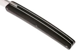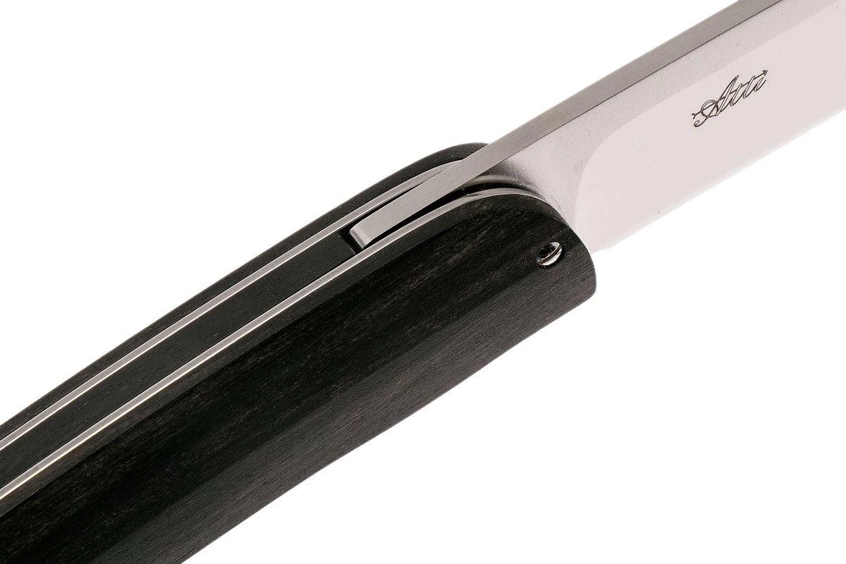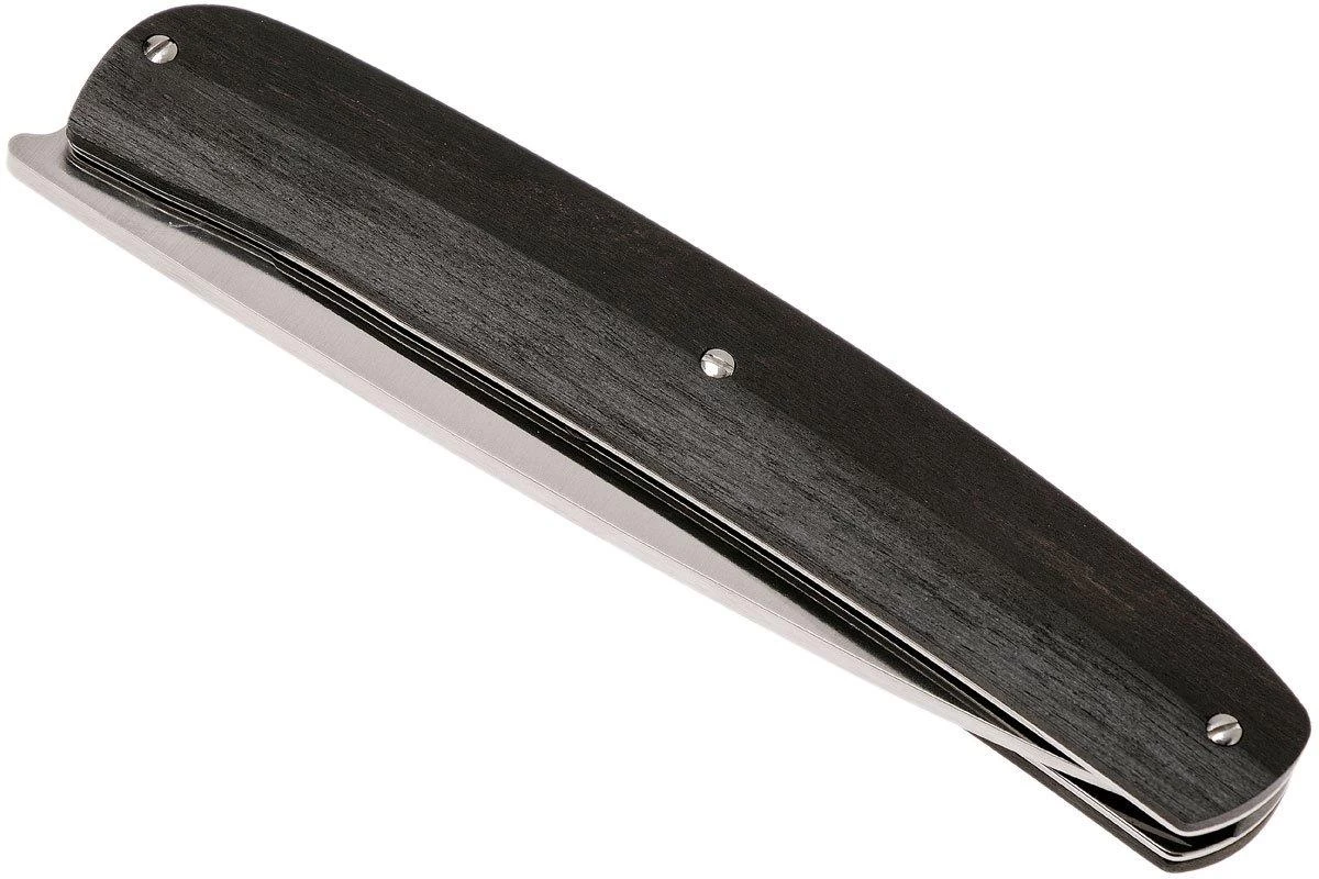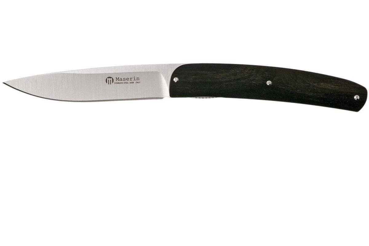 El Maserin Gourmet es un cuchillo de caballero ligero y elegante, diseñado como cuchillo de carne plegable. Puede que lo hayas experimentado antes: un gran restaurante, un delicioso trozo de filete, pero unos cuchillos terribles. Con el Maserin Gourmet siempre tendrás cerca el cuchillo adecuado para cortar tu filete. El diseñador Attilio Morotti ha sabido combinar las líneas típicas italianas con materiales notables para el Gourmet. Por ejemplo, el mango es de una hermosa madera de ébano oscura. Un aspecto especial de este cuchillo es que el contrafuerte (la parte entre los mangos) también está hecho de este tipo de madera.
