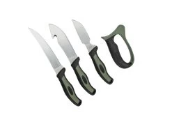 El Old Timer Lightweight Field Dressing Kit es un set de caza asequible y versátil. El juego contiene tres cuchillos de caza, un afilador de cuchillos y tres pares de guantes de látex. Viene en una bolsa de nylon para guardarlo.