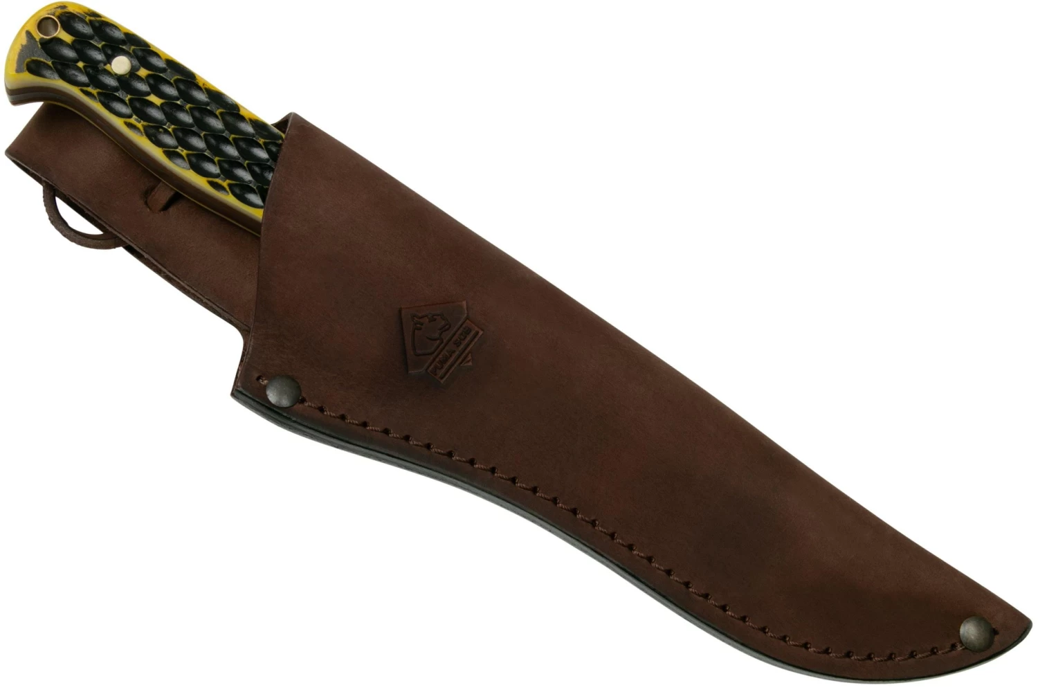 El PUMA SGB Buffalo Hunter es un cuchillo de caza grande y resistente. El hermoso mango de este cuchillo de caza está hecho de hueso coloreado, que es un material natural, lo que significa que no hay dos cuchillos iguales. La textura añadida al mango hace que se mantenga firme en la mano. Las cachas están unidas por dos remaches de color bronce. Un hermoso escudo con el logotipo de PUMA SGB está colocado en el mango. La hoja está hecha de acero 1.4116, un acero alemán que conserva bien su afilado y es fácil de afilar. El mango y la hoja están separados por un fino cabezal de latón. Esto también funciona como un protector de dedos, por lo que tus dedos están seguros incluso durante las tareas de corte más pesadas.