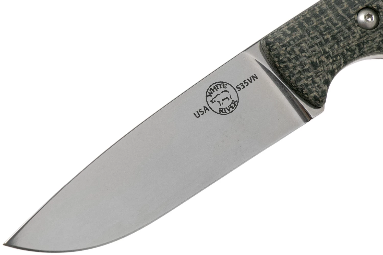 El White River Knives Hunter es un impresionante cuchillo de caza, diseñado por Owen Baker Jr. Este diseñador pasó mucho tiempo trabajando en la ergonomía del cuchillo. La llamada forma de «botella de coca-cola» del mango (estrecho en la parte delantera, más grueso, más fino y más grueso al final) lo ha elevado a un nivel completamente nuevo. En la parte delantera es tan fino que tienes mucho control sobre el cuchillo.